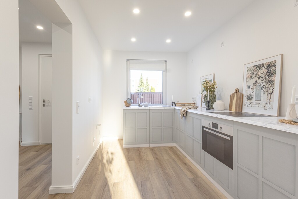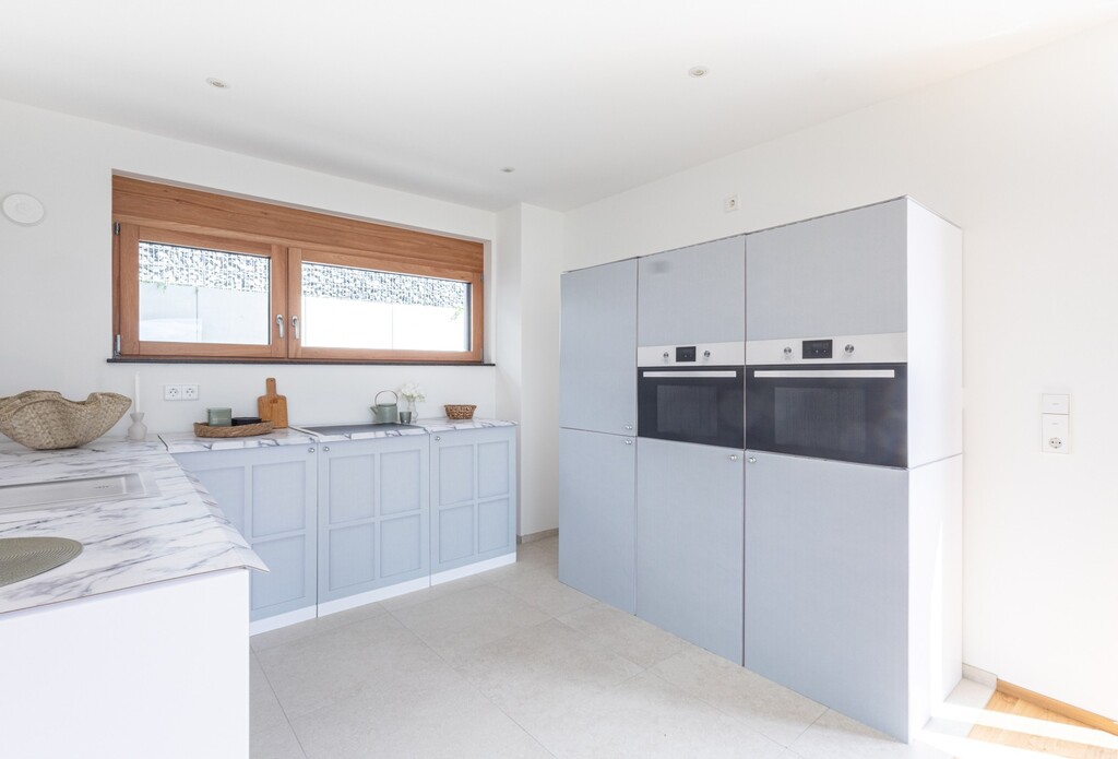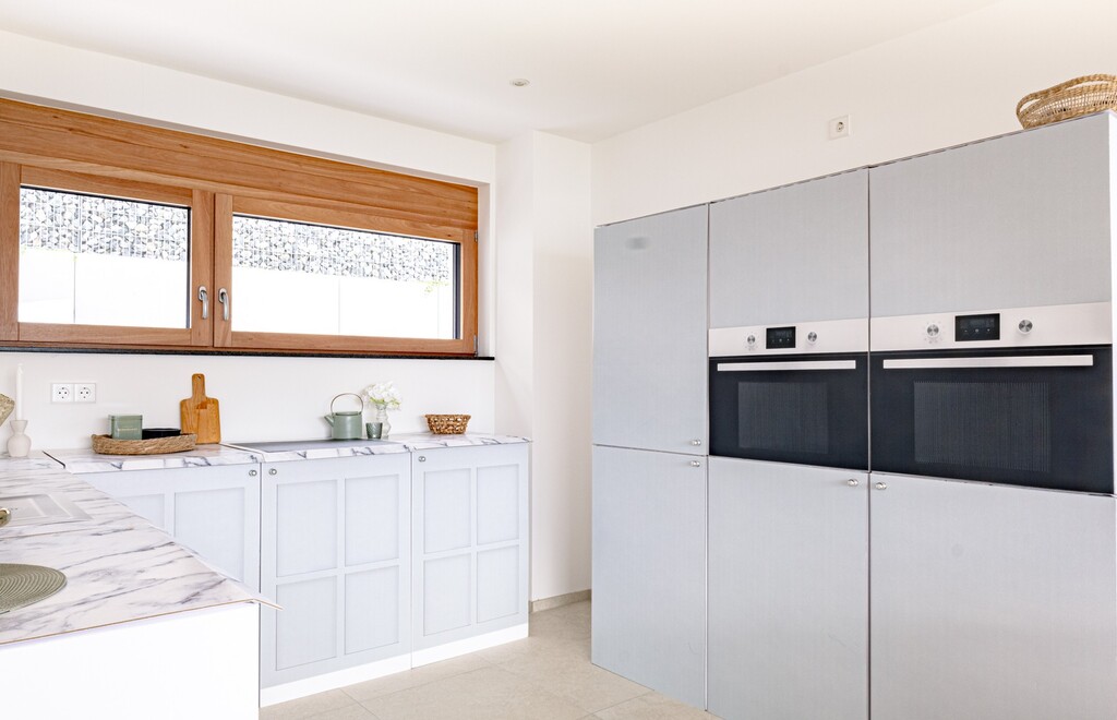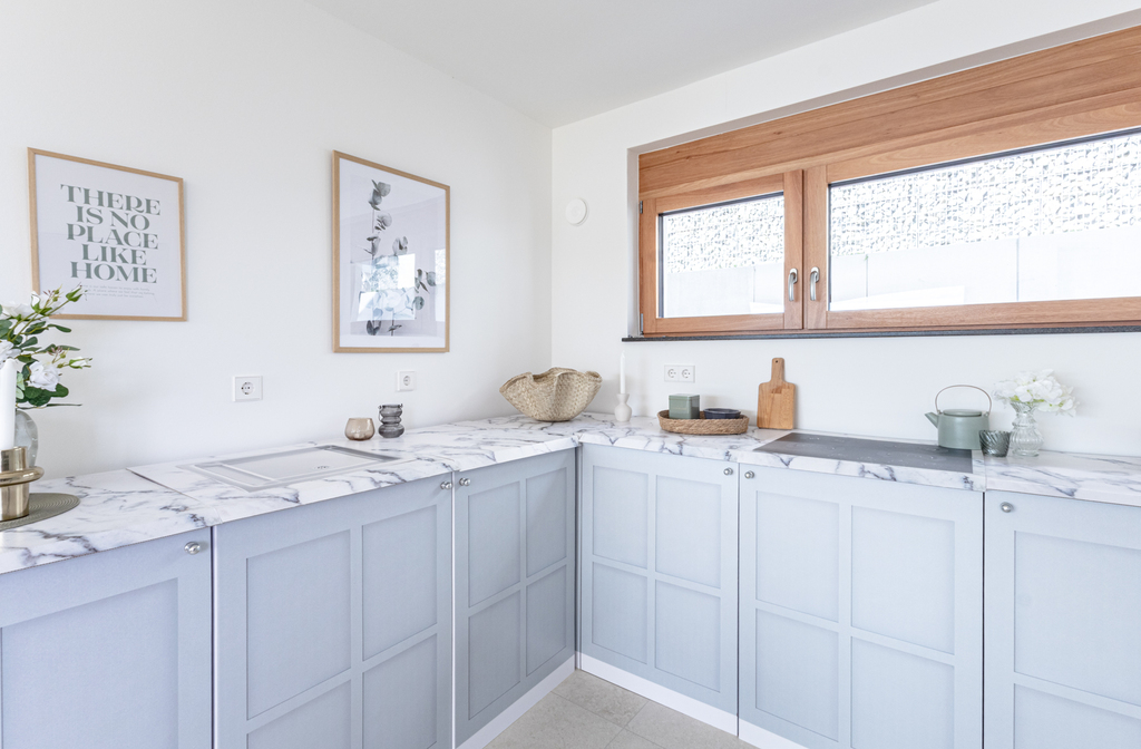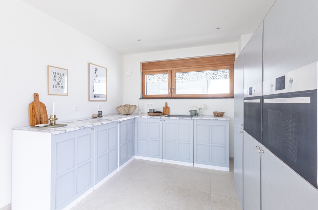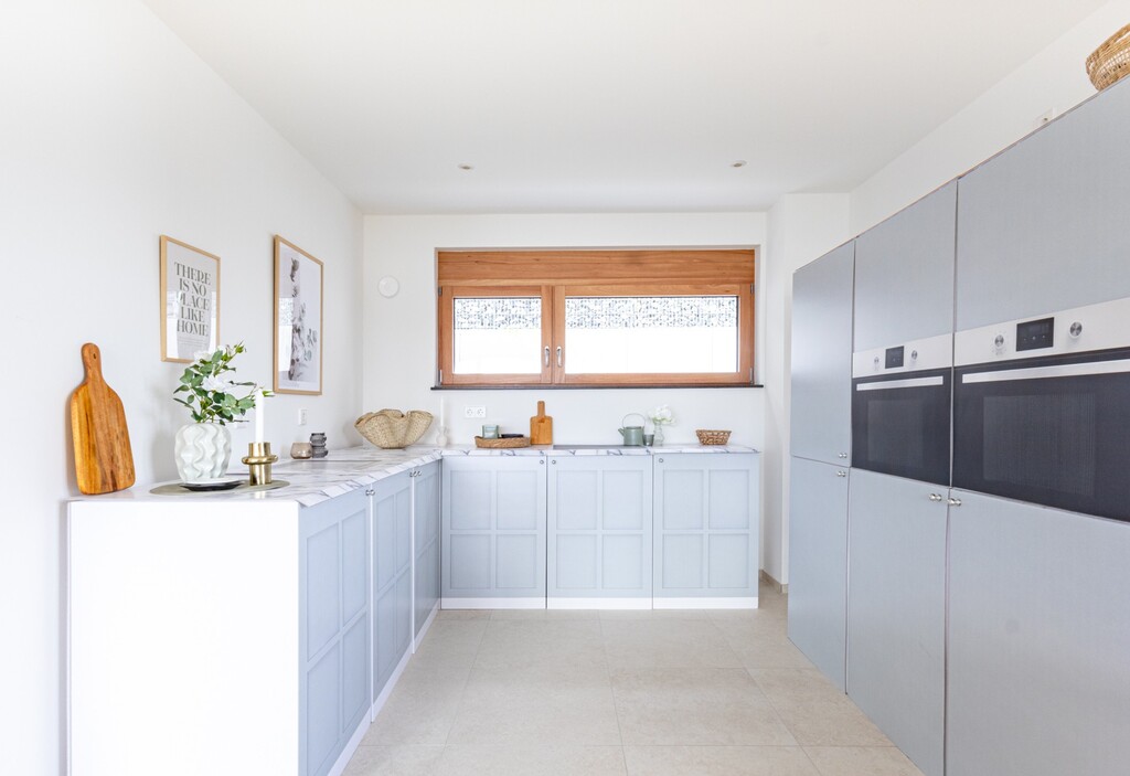 Unsere hellgraue Küche hat einen wunderschönen Farbton, fasst schon "hellgrau mit einem himmelblauen Touch."